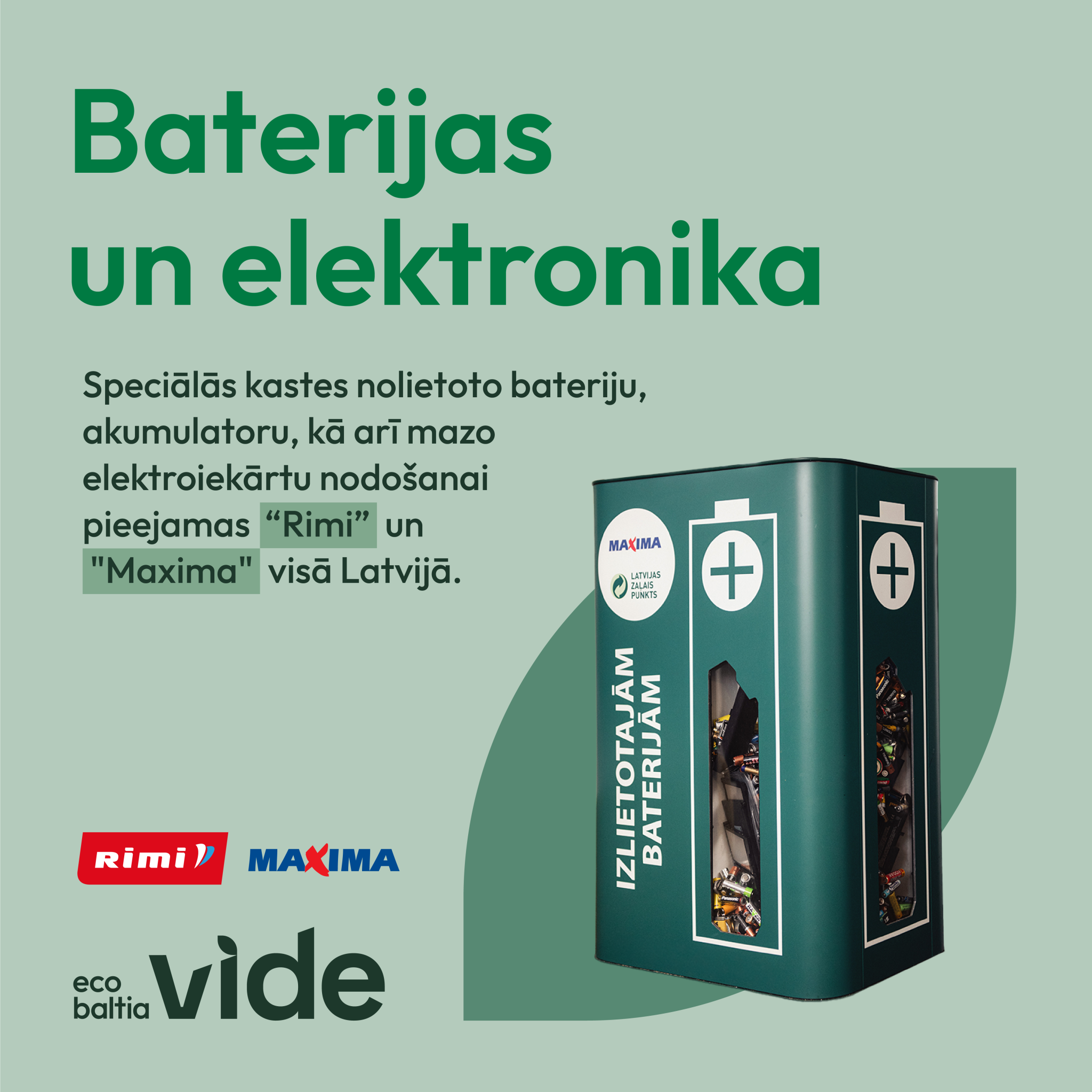Speciālās kastes nolietoto bateriju, akumulatoru, kā arī mazo elektroiekārtu nodošanai pieejamas “Rimi” un "Maxima" visā Latvijā. Veikalu adreses, kur pieejamas bateriju, akumulatoru un elektroiekārtu nodošanai paredzētie konteineri pieejamas ŠEIT.