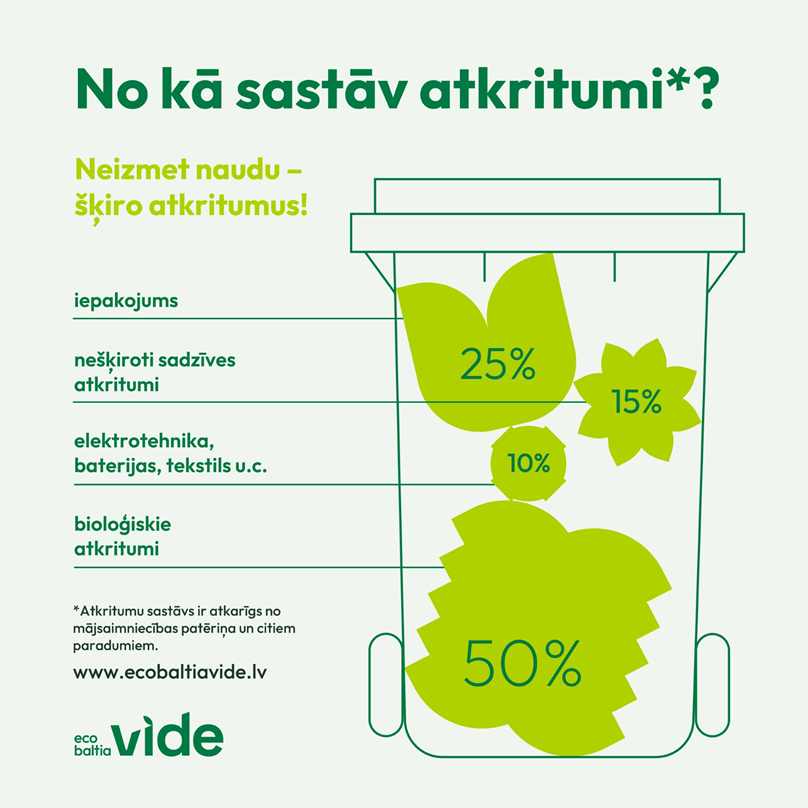 Pirmais un efektīvākais solis, kā samazināt atkritumu apsaimniekošanas maksu, ir šķirot atkritumus, jo apmēram 85 % atkritumu iespējams šķirot un nodot pārstrādei. “Eco Baltia vide” saviem klientiem nodrošina dažādu atkritumu veidu šķirošanas iespējas. Bez maksas uzņēmums pieņem šķirotu vieglo iepakojumu jeb papīra, plastmasas, metāla iepakojumu, stikla iepakojumu – dzērienu stikla pudeles un burkas -, nolietotu elektrotehniku un baterijas, tekstilu. Savukārt par samazinātu maksu iespējams šķirot bioloģiskos atkritumus.