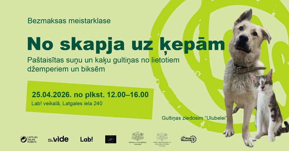 Ražotāju atbildības organizācija “Latvijas Zaļais punkts” kopā ar vides apsaimniekošanas uzņēmumu “Eco Baltia vide” un tā izveidoto konceptveikalu “Lab! Veikals” 25. aprīlī rīko bezmaksas meistarklasi “No skapja uz ķepām”, kurā interesenti aicināti no lietota tekstila veidot dzīvnieku gultas. Meistarklase notiks no plkst. 12.00 līdz 16.00 “Lab! veikals” telpās Latgales ielā 240, Rīgā. Pasākuma laikā tapušās dzīvnieku gultas vēlāk tiks ziedotas dzīvnieku patversmei “Ulubele”.